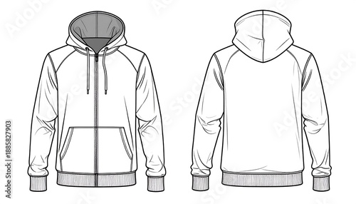 Fashionable front and back views of a hooded zipped sweatshirt. Outline design