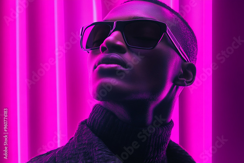 Fashionable Man Wearing Black Eyewear with Solid Neon Purple Details, Featured in a Modern Lifestyle Portrait