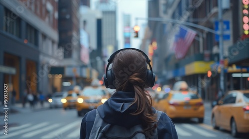 fasion beautiful girl wearing headphones walks down the street