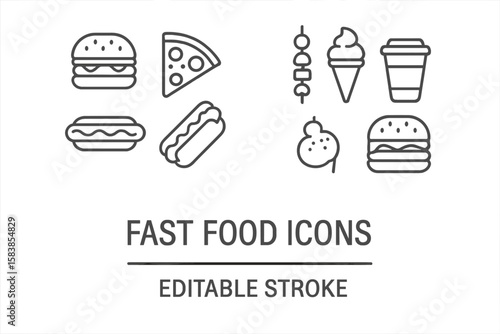 Fast food line icon set. Linear icons collection for junk food, street food. Contains burger, pizza, hot dog, kebab, ice cream, coffee, donut. Editable stroke vector for web, UI.