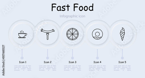 Fast food set icon. Fats, carbohydrates, cup of coffee, pizza, ice cream cone, infographic, donut, sausage, croissant, neomorphism, black text on white background, unhealthy diet. Junk food concept.