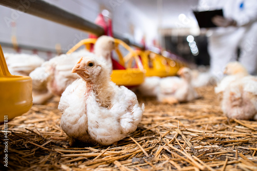 Fast growing chicken at modern poultry farm for meat production.