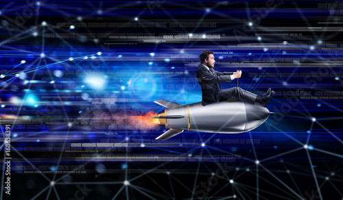 Fast internet concept with a businessman over a rocket