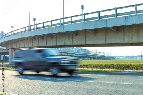 fast moving blurred black car on the background of a trestle bridge