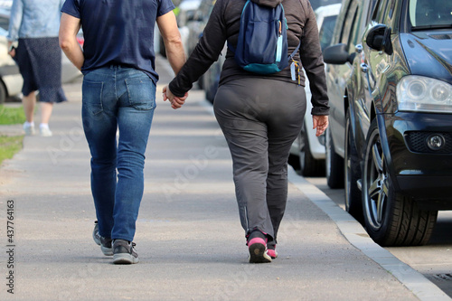 Fat woman in sportswear and slim man in jeans walking along a city street with parked cars. Couple in love holding hands, summer fashion