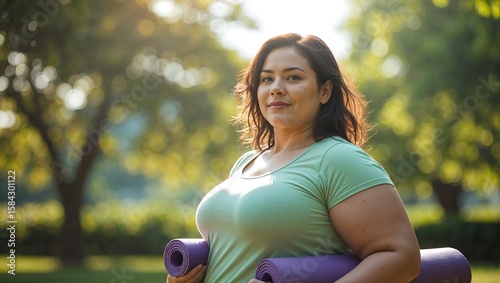 Fat women wearing green t-shirt ready to yoga