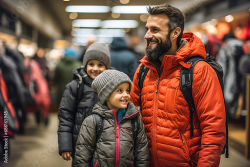 Father and little boy walking and looking around in big sports store. Many shelves with sport equipment and products.