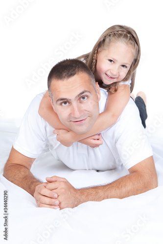 Father and little daughter lying on a bed