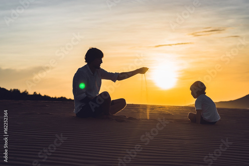 Father and son at the red desert at dawn. Traveling with children concept
