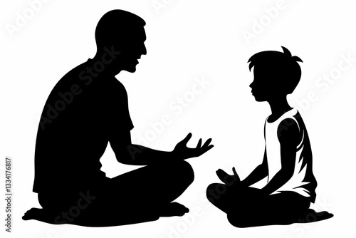 father and son sitting in pose lotus and watching silhouette vector illustration