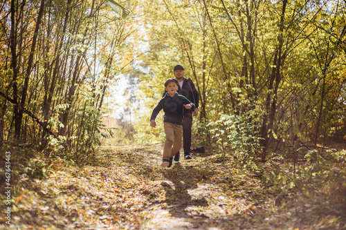 Father and son spend time in forest. Happy dad and child boy enjoying autumn time on vacation in a sunny park. Kids love parents affection and tenderness, lovely family.
