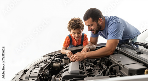 Father and son working together on car engine in bright workshop