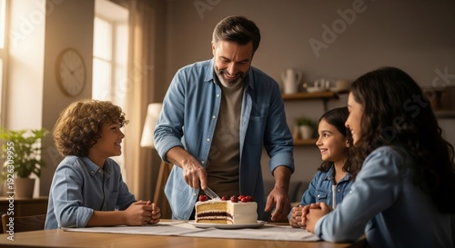 Father Cuts Birthday Cake With Family in Brightly Lit Dining Room