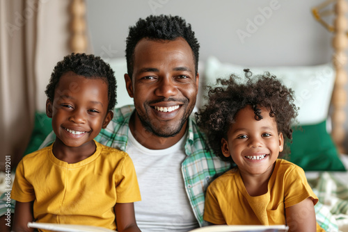 Father reading bedtime story to children, Literacy Day, evening rituals, copy space, deep depth of field, family bonding concept.