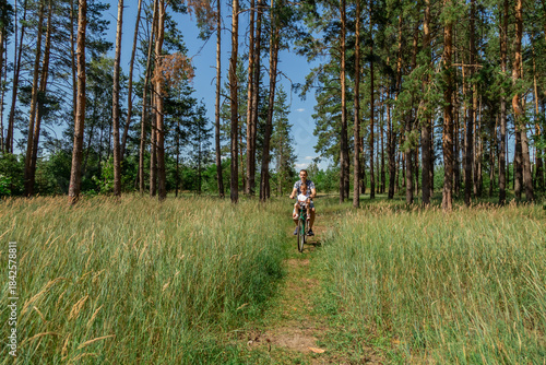 father riding a bike in summer forest with his baby daughter sitting in child seat