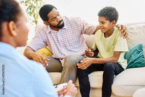Fatherwith his teenage son boy at meeting with social worker, psychologist discussing mental health family sitting on sofa in psychotherapist office