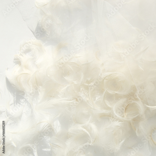 Feathers and white tulle fabric background. Abstract artistic composition with feathers and transparent material feathers.