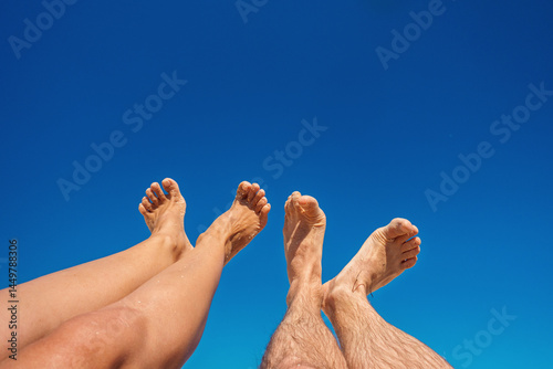 Feet on a Sunny Day Vacation Concept Two Pairs of Legs Crossed in the Blue Sky Relaxation