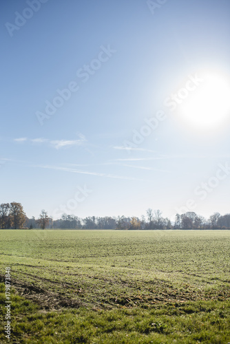 Feld mit frischem Grün und Morgentau, Sonne rechts im blauen Himmel, Blick bis zum Horizont, Hochformat