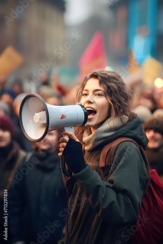 Female activist protesting via megaphone with a group of demonstrators in the background