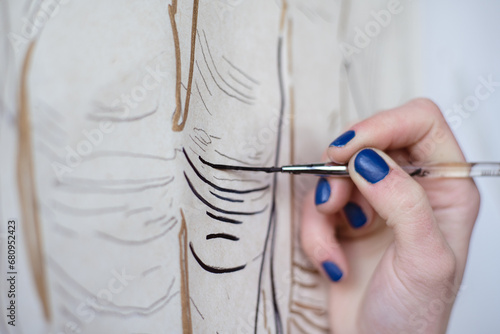Female artist drawing painting with paint brush and black paint. Graphic Painting. Creating modern Art