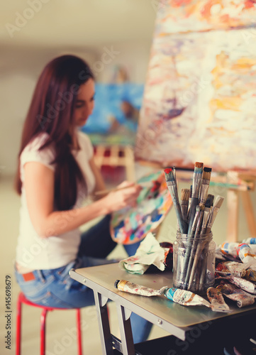 Female Artist Working On Painting In Studio. Background image, selective focus on foreground