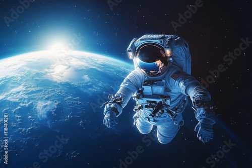 Female astronaut floating in space with Earth glowing in the background