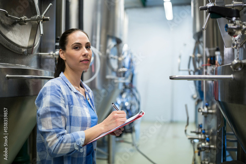 Female brewery technician standing between steel tanks in hall taking notes with clipboard and pen