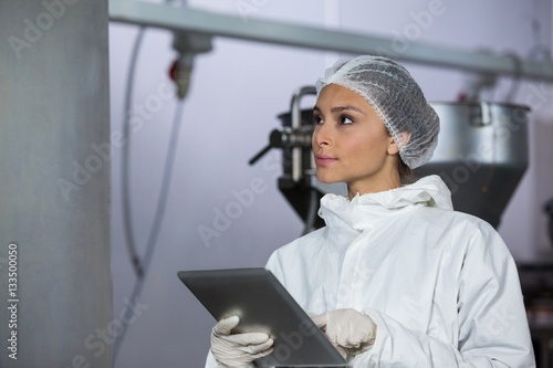 Female butcher using digital tablet