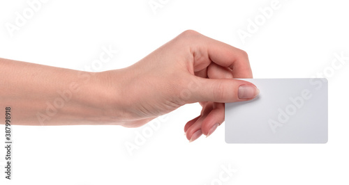 Female caucasian hands with blank business card isolated on white background. blank for designers