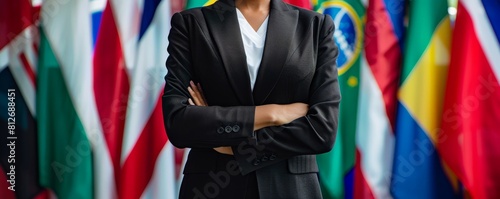 Female CEOs torso in a black suit, presented against a backdrop of an ongoing business meeting, ideal for discussions on corporate endurance
