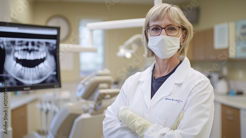 Female dentist in a modern dental clinic wearing a mask and gloves, standing confidently with a dental X-ray on screen. Image made using Generative AI.