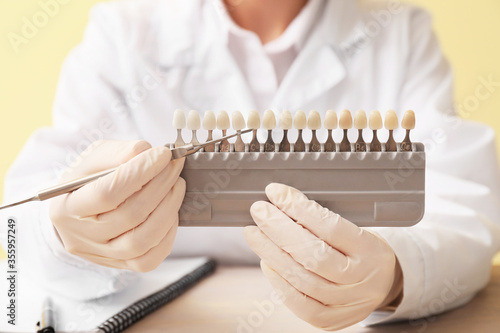 Female dentist with teeth color samples and tool, closeup