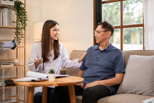 Female doctor visit male elderly patient at home and explaining