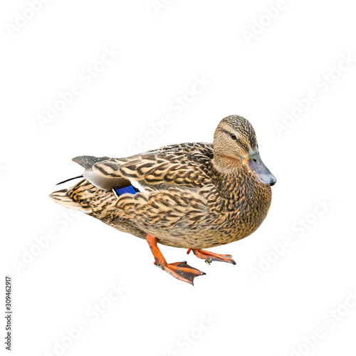 Female duck also called as a hen with brown and blue feathers isolated on white background, close up view