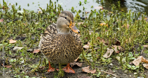 Female duck standing on gras next to pond, Vancouver Canada