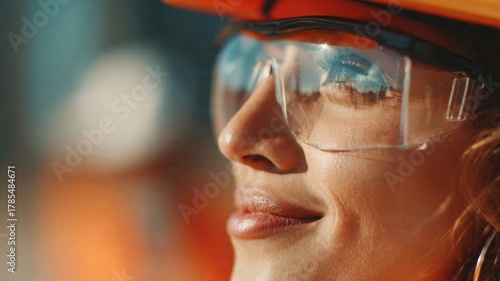 Female engineer reflecting on construction site close-up portrait urban environment positive vibes