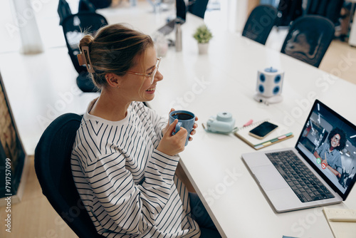 Female entrepreneur talking with client via video call and drink coffee while sitting in coworking