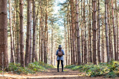 Female explorer with backpack standing in Cannock Chase forest