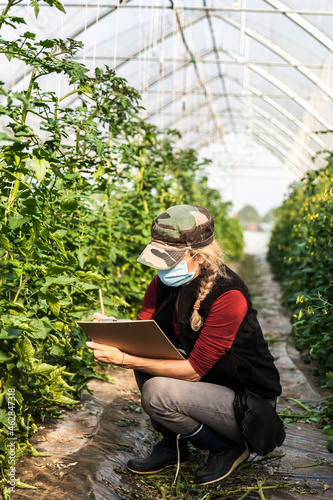 Female farm worker with surgical mask checking the growth of organic tomatoes in a greenhouse