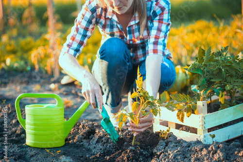 Female farmer works in a garden in a plaid shirt. planting tomato seedlings