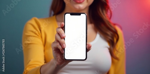 Female figure holds up a blank screen mock up mobile phone , phone, minimalist, mobile