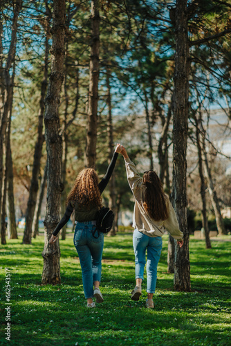 Female friends holding their hands up and hanging out in the park. Back view shot