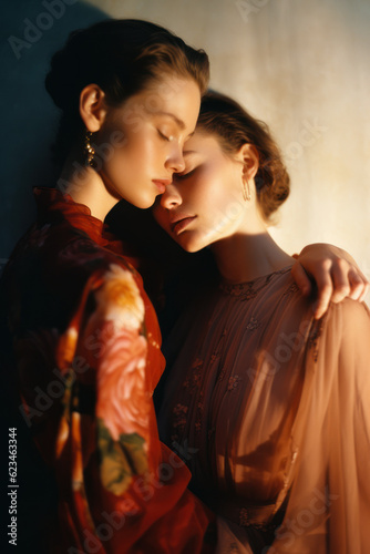 female friends/models/lgbtq + couple in magazine editorial fashion/beauty photo shoot embracing/kissing with cinematic light film photography look - generative ai art