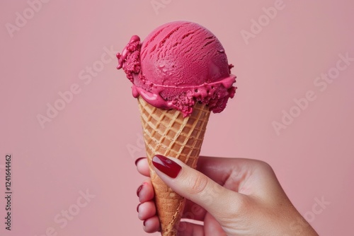 Female hand holding a raspberry ripple ice cream cone against a blue sky, showing the beautiful red swirls