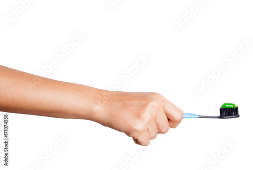 Female hand holding a Toothbrush with toothpaste isolated on white background