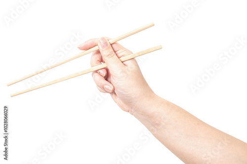 Female hand holding a wood chopstick isolated on white background.