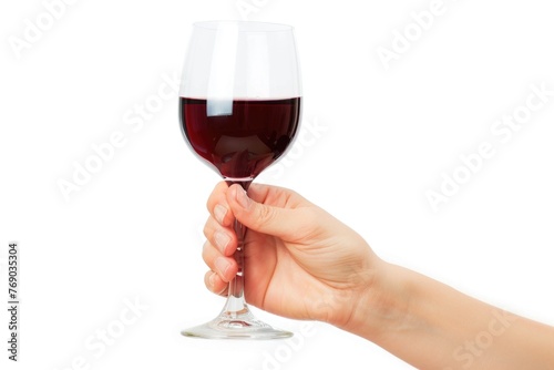 Female hand holding glass of red wine isolated on white background