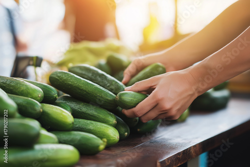 Female hands choosing fresh green cucumbers at local farmers market for organic food brand, grocery store and autumn harvest advertising