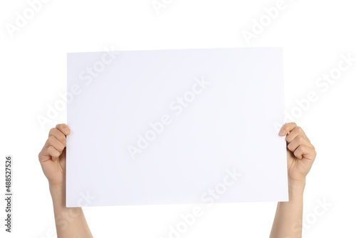 Female hands hold blank banner, isolated on white background
